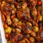 This Baked Chicken Leg and Vegetables recipe features tender chicken drumsticks marinated in a flavorful ranch seasoning blend, roasted alongside hearty potatoes, carrots, and garlic cloves. The chicken is baked to juicy perfection with a crispy skin finish, enhanced by a splash of white wine and chicken stock to keep the dish moist and savory. A comforting, all-in-one meal that’s easy to prepare and perfect for family dinners.