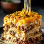 Cattle Drive Casserole is a hearty and flavorful layered dish perfect for family dinners. This recipe combines seasoned ground beef, sautéed vegetables, a biscuit base, and creamy sour cream topping with cheese and salsa, baked to bubbly perfection for a comforting Tex-Mex inspired casserole.