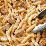 - Assemble the dish: Add the cooked pasta and Alfredo sauce to the skillet with the cooked chicken. Toss gently to combine and coat the pasta evenly with the sauce. Transfer the mixture to a greased 13 x 9 inch baking dish and sprinkle the 1/2 cup of shredded cheddar cheese evenly over the top.