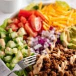 - Assemble the Bowls: Combine the shredded iceberg and chopped romaine lettuce in a large mixing bowl. Divide this lettuce mixture evenly among 4 shallow bowls or plates. Top each bowl with the cooked burger mixture, then layer on cucumber, tomato, avocado, pickles, red onion, shredded cheddar cheese, and crumbled bacon. Drizzle or spoon the smoky BBQ ranch dressing over each bowl. Optionally, sprinkle crushed Doritos on top for extra crunch and flavor. Serve immediately or allow guests to build their own bowls.
