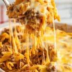 - Layer Casserole: Pour half of the beef and pasta mixture into a 9×13-inch glass baking dish. Sprinkle half of the shredded mozzarella and cheddar cheese evenly over the top.