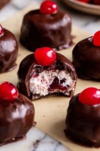 Melt your chocolate chips and shortening or coconut oil in a saucepan over low heat, stirring frequently. This thinning blend makes it easier to dip the balls smoothly without clumps. Using two forks or toothpicks, dip each chilled ball into the chocolate, then set them on parchment paper. Before the chocolate sets, press a candied cherry half on top for that signature look and extra cherry pop.