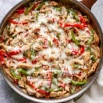 This Chicken Cheesesteak Skillet is a flavorful and easy one-pan meal featuring tender, seasoned chicken breasts sautéed with sweet bell peppers and onions, all topped with melted provolone cheese for a satisfying and cheesy finish.