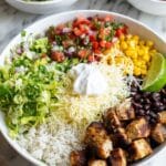 This Chipotle Burrito Bowl copycat recipe combines flavorful chipotle chicken, cilantro lime rice, and fresh, vibrant salsas to create a hearty, satisfying meal. Topped with shredded lettuce, Monterey Jack cheese, guacamole, sour cream, and lime wedges, it’s a perfect balance of smoky, tangy, and fresh flavors, ideal for a quick lunch or dinner.