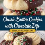 These classic butter cookies are soft, buttery, and beautifully swirled, partially dipped in rich melted chocolate and adorned with festive sprinkles. Perfect melt-in-your-mouth treats for Christmas celebrations or any holiday gathering, combining simple ingredients for a timeless taste and elegant presentation.