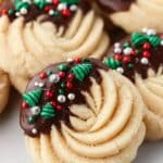 These classic butter cookies are soft, buttery, and beautifully swirled, partially dipped in rich melted chocolate and adorned with festive sprinkles. Perfect melt-in-your-mouth treats for Christmas celebrations or any holiday gathering, combining simple ingredients for a timeless taste and elegant presentation.