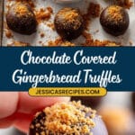 Delightful Chocolate Covered Gingerbread Truffles made with crunchy gingersnap cookies, creamy cream cheese, and spiced with cinnamon. These bite-sized treats are coated in smooth melting chocolate and finished with a sprinkle of cookie crumbs for extra texture and flavor. Perfect for holiday gatherings or as a festive dessert.