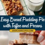 A rich and decadent bread pudding pie featuring a buttery crust topped with a creamy mixture of sweetened condensed milk, toffee bits, and pecans, baked to golden perfection and served chilled as delightful bars.