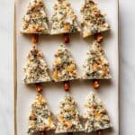 These Christmas Cheese Trees are a festive and easy appetizer featuring creamy cheese wedges coated in fresh herbs and spices, adorned with pretzel stick ‘trunks’ for a charming holiday presentation. Perfect for quick holiday parties and gatherings.