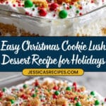 Christmas Cookie Lush is a festive, no-bake layered dessert featuring a buttery Oreo crust, creamy peppermint-infused cream cheese layer, luscious cheesecake pudding, and a whipped topping crowned with crushed cookies and holiday sprinkles. Perfect for holiday gatherings, this easy-to-make treat combines rich flavors and textures to delight your guests.