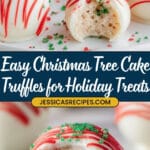 Delight in these festive Christmas Tree Cake Truffles, combining soft vanilla cake with creamy cream cheese, all coated in luscious white chocolate and decorated with red drizzle and green sanding sugar for a perfect holiday treat.