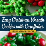 These festive Christmas Wreath Cookies are a delightful no-bake treat that combines crispy cornflakes coated in sweet, colored marshmallow with a hint of vanilla, shaped into charming wreaths and decorated with red candies, perfect for holiday celebrations and easy to make with kids.