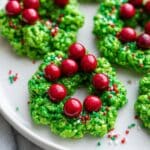 These festive Christmas Wreath Cookies are a delightful no-bake treat that combines crispy cornflakes coated in sweet, colored marshmallow with a hint of vanilla, shaped into charming wreaths and decorated with red candies, perfect for holiday celebrations and easy to make with kids.
