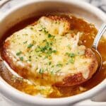 - Serve: Carefully remove from the oven and serve immediately while hot and cheesy. Enjoy the classic comforting flavors of French Onion Soup!