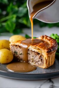 - Buttery, Flaky Pastry: Homemade hot water crust pastry gives you that iconic sturdy yet flaky texture that holds the filling perfectly.