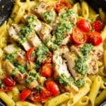 - Serve: Plate the creamy chicken pasta and garnish with extra Parmesan cheese, halved cherry tomatoes, and an additional drizzle of pesto if desired.