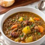 Potaje de Lentejas is a hearty Cuban lentil soup featuring tender lentils, smoked pork, potatoes, and pumpkin simmered in a flavorful broth infused with aromatic spices. This comforting stew balances protein and vegetables, making it perfect for a satisfying meal any day.