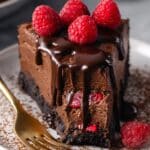 - Garnish and Serve: Use a thin, sharp knife wiped between slices to cut the cheesecake. Top each slice with a drizzle of chocolate sauce, fresh raspberries, and a light dusting of cocoa powder. Optionally, drizzle chocolate sauce over the whole cake and decorate with raspberries and cocoa powder if serving whole. Store refrigerated, loosely covered, for up to 5 days.