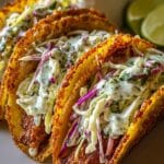These Dill Pickle Ranch Smash Chicken Tacos with Crispy Cheese Delight are a flavorful and fun twist on traditional tacos. Ground chicken seasoned with garlic, paprika, and pepper is cooked and smashed into crispy cheese laces, layered with tangy chopped dill pickles, crunchy cabbage, and a creamy ranch-seasoned cottage cheese topping. Drizzled with pickle brine for a zesty finish, these tacos deliver a delicious balance of savory, tangy, and creamy textures perfect for a quick and satisfying meal.