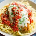 Classic Chicken Parmesan with crispy breaded chicken cutlets topped with marinara sauce and melted mozzarella cheese, baked to perfection. This comforting Italian-American dish is perfect for a family dinner and garnished with fresh basil or parsley for added flavor.