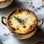 - Garnish and Serve: Garnish each bowl with additional fresh thyme leaves if desired. Serve immediately and enjoy your classic French Onion Soup.