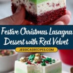 This Christmas Lasagna Dessert is a festive, layered treat combining rich red velvet cake, creamy candy cane-infused cream cheese, and vibrant green vanilla pudding, topped with whipped topping and holiday sprinkles. Perfect for holiday parties, this no-bake-lasagna styled dessert offers a colorful and delicious way to celebrate the season.