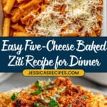 This Five-Cheese Ziti al Forno is a comforting baked pasta dish that combines ziti pasta with a rich blend of marinara and Alfredo sauces, layered with a luscious mix of mozzarella, ricotta, provolone, and Romano cheeses. Topped with a golden, garlicky Parmesan and panko breadcrumb crust, it’s a perfect hearty meal ideal for gatherings or a cozy family dinner.