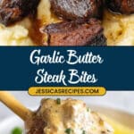 Savor these Garlic Butter Steak Bites served with creamy Parmesan sauce over cheesy mashed potatoes, a hearty and flavorful meal perfect for any steak lover.