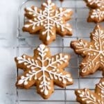- Decorate with Glaze: Transfer the glaze to a piping bag fitted with a small tip and decorate the cooled snowflake cookies by piping snowflake designs onto each cookie.