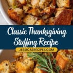 This stuffing pairs perfectly with roasted turkey (obviously!) but I also love serving it alongside mashed potatoes with gravy, green bean casserole, and cranberry sauce. Together, they create that classic Thanksgiving plate everyone looks forward to.