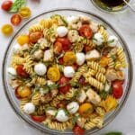 - Assemble the Pasta Salad: In a large serving bowl or dish, layer or toss together the cooked pasta, grilled chicken chunks, halved tomatoes, mozzarella balls, and fresh basil. Drizzle the reserved dressing over the top, then toss gently to evenly coat all ingredients.
