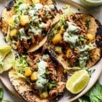 These Hawaiian Chicken Tacos with Jalapeño Pineapple Salsa bring together tender, flavorful chicken cooked with garlic, shallots, chili powder, and pineapple, topped with a fresh and spicy pineapple salsa and a creamy Jalapeño Basil Ranch. Perfectly balanced between sweet, spicy, and tangy, these tacos are an easy, vibrant meal that uses the Instant Pot for quick cooking and finishes with a broil for a nice charred touch. Ideal for a flavorful weeknight dinner or casual entertaining.