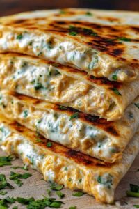 Lay your tortilla flat on a cutting board. Spoon half of your creamy chicken mixture onto one side of the tortilla, spreading it evenly but leaving about a half-inch of space from the edge. This space helps when folding the quesadilla, so the filling doesn’t seep out during cooking. Fold the empty half of the tortilla over the filling to create a neat half-moon shape, and press down gently to seal the edges together.
