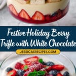 This luscious Holiday Berry Trifle layers homemade sponge cake, tangy cranberry jelly studded with fresh strawberries, a rich white chocolate custard, and a smooth mascarpone cream. Garnished with a medley of fresh berries and mint, it’s a festive and elegant dessert perfect for holiday celebrations.