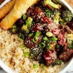 - 1 ½ pounds flank steak, halved lengthwise, then sliced against the grain into ½ inch thick strips