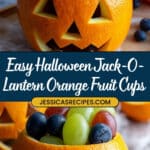 These festive Jack-O-Lantern Orange Fruit Cups are a fun and healthy way to celebrate Halloween. Hollowed-out oranges are carved like pumpkins and filled with a refreshing mix of blueberries and quartered grapes, making a colorful, kid-friendly fruit cup perfect for parties or snacks.