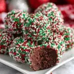 - Coat with Sprinkles: Pour the Christmas-themed nonpareils into a shallow bowl. Roll each chocolate ball in the sprinkles until fully coated, giving the truffles a festive look.
