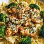 A flavorful and hearty dish featuring tender bowtie pasta and succulent chicken pieces tossed in a zesty lemon butter sauce with fresh broccoli and Cajun-seasoned spices, finished with Parmesan cheese and fresh herbs for a comforting, yet vibrant meal.
