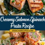 This Salmon Spinach Pasta is a delicious and nutritious dish featuring tender salmon fillets and fresh spinach tossed in a creamy Parmesan sauce with a hint of lemon zest. Perfect for a quick and elegant weeknight meal, this recipe combines fresh ingredients with simple cooking techniques to create a flavorful pasta dish that serves four.