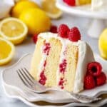 - Assemble and Garnish: Once the cakes have cooled, remove them from the pans. Spread a generous layer of the lemon cream cheese frosting onto one cake layer. Stack the next cake layer on top and spread frosting over the top and sides of the cake. Garnish with fresh raspberries and lemon slices. Optionally, chill for 20-30 minutes before serving to set the frosting.