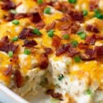 - Add Toppings and Finish Baking: Remove the foil from the casserole. Evenly sprinkle the Mexican cheese blend, cooked and crumbled bacon, and diced green onions over the top. Return the casserole to the oven and bake uncovered for 8 to 10 minutes, until the cheese has melted and is bubbly.