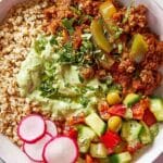 - Assemble and Serve: Divide the warmed whole grains evenly into serving bowls. Top each with the seasoned ground beef. Drizzle some of the prepared harissa oil over the beef if using. Add a spoonful of tahini sauce or creamy feta dressing on top. Finish by layering the fresh vegetable mix, chopped herbs, olives, and sliced radishes. Serve any remaining sauces, veggies, and olives on the side for additional customization.
