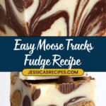 Moose Tracks Fudge is a rich, layered treat combining creamy white chocolate vanilla fudge with a dark semi-sweet chocolate ganache swirl, studded with mini peanut butter cups. This no-bake fudge comes together easily using a microwave or stovetop and is perfect for gifting or indulging any chocolate and peanut butter lover.