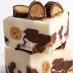 Moose Tracks Fudge is a rich, layered treat combining creamy white chocolate vanilla fudge with a dark semi-sweet chocolate ganache swirl, studded with mini peanut butter cups. This no-bake fudge comes together easily using a microwave or stovetop and is perfect for gifting or indulging any chocolate and peanut butter lover.