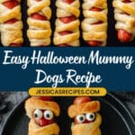 This Mummy Dogs Recipe is all about simplicity and fun. The two main ingredients complement each other perfectly—the buttery, flaky crescent roll dough wraps around savory hot dogs to create this festive treat. When shopping, look for crescent rolls with perforations you can press together so the dough holds better when you cut strips.