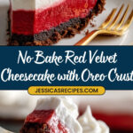This no-bake Exquisite Red Velvet Cheesecake features a rich Oreo crust topped with a luscious red velvet cream cheese filling, crowned with whipped cream. Perfectly smooth and velvety, this cheesecake requires no baking, making it an excellent choice for an impressive dessert that’s easy to prepare and ideal for special occasions or indulgent treats.