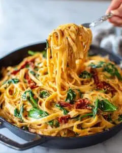This One-Pan Creamy Tomato Spinach Pasta Recipe freezes okay, but texture may change slightly (especially the spinach). I recommend freezing only if you plan to reheat for casual meals where texture isn’t critical. Use airtight containers and thaw overnight in the fridge for best results.