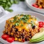 One-Pot BBQ Chicken and Rice is a flavorful, comforting dish combining tender, saucy chicken thighs with a savory blend of rice, beans, and corn, all cooked together in one skillet. Topped with melted colby jack cheese and fresh avocado, tomatoes, and herbs, this recipe is perfect for a hearty and easy weeknight meal with minimal cleanup.