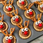 - Attach Antlers: Break pretzels in half to form reindeer antlers and gently place two halves into each peanut butter cup on top of the cookies.