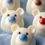 Delightfully festive Polar Bear Cookies made by decorating double stuffed sandwich cookies dipped in white candy melts and adorned with colorful candy-coated chocolates for ears and noses. Perfect for a fun, creative treat that’s both visually appealing and delicious.